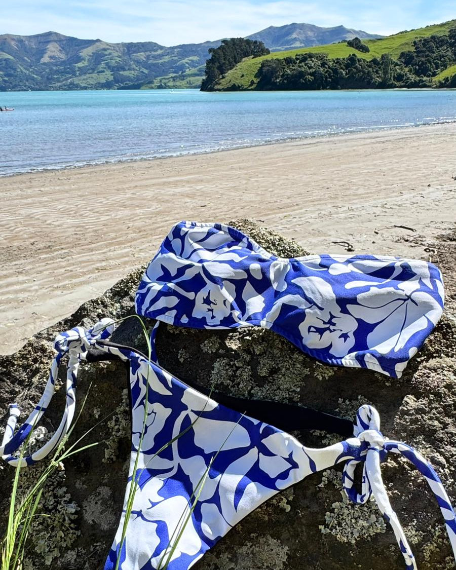 - White base with electric blue abstract floral print (outer side)
